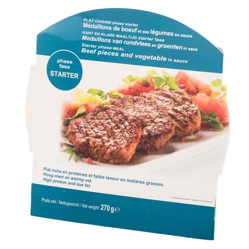 ProduseDeSlabire.RO vă oferă o masă delicioasă bogată în proteine ​​ce se potriveşte în orice dieta hiperproteica, acestă specialitate  clasică din bucătăria franceză: medalionul din carne de vită cu legume. Gata de mâncat, necesită doar încălzire. Această rețetă este făcută cu medalioane din carne de vită. 2 minute în cuptorul cu microunde sunt suficiente pentru a revigora toate aromele acestui fel de mâncare gustoasă. Puteți încălzi, de asemenea, într-un bain-marie fără a desface capacul.